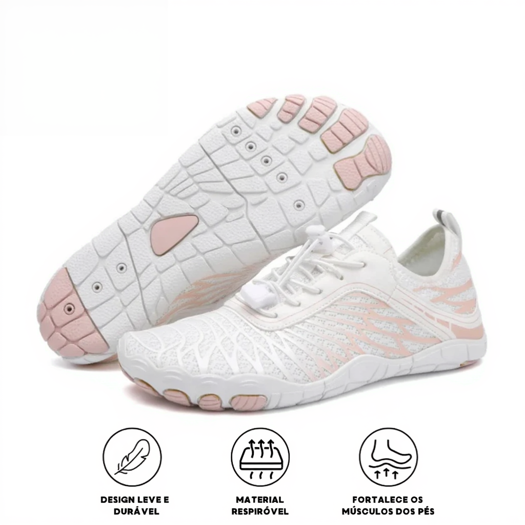 Este tênis descalço possui uma caixa larga para os dedos que oferece amplo espaço para os dedos se moverem e se abrirem naturalmente. Esse design pode ajudar a reduzir a pressão e o desconforto na área dos dedos, tornando-o ideal para pessoas com condições como joanetes, dedos em martelo ou outros problemas nos pés que exigem espaço extra.