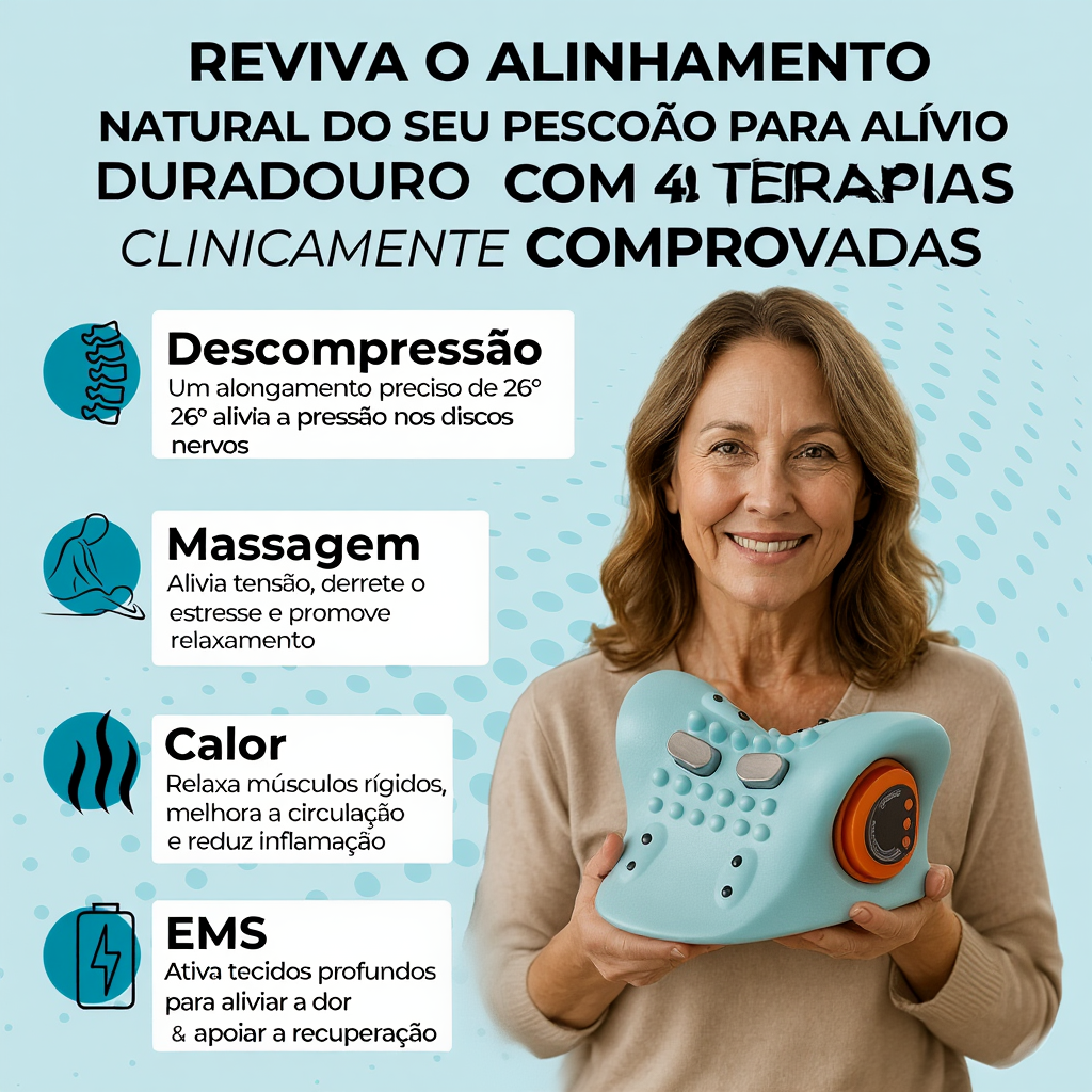 Essa combinação ajuda a relaxar músculos rígidos, restaurar a forma natural do pescoço e aliviar a compressão nervosa — enfrentando a causa raiz do desconforto e da rigidez.